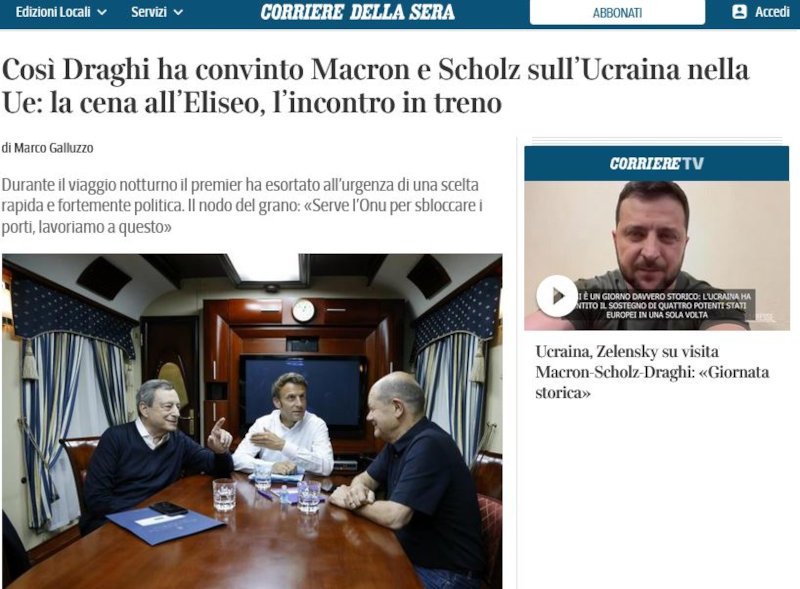 Όπως σημειώνει, η αρχή έγινε με το κεκλεισμένων των θυρών δείπνο διάρκειας σχεδόν δύο ωρών του Ιταλού πρωθυπουργού με τον Γάλλο πρόεδρο στο Ελιζέ την περασμένη εβδομάδα: «Ο γαλλικός θεσμικός μηχανισμός στις αρχές Ιουνίου ήταν ακόμα κολλημένος στην ιδέα μιας πολιτικής κοινότητας εκτός της ΕΕ, στην οποία η Ουκρανία θα μπορούσε να είναι υποψήφια. Όταν τελείωσε η συνάντηση, ο Μάριο Ντράγκι σχεδόν είχε πείσει τον Γάλλο πρόεδρο. Η άφιξη στην ουκρανική πρωτεύουσα των τριών Ευρωπαίων ηγετών συμπίπτει με μια ενότητα, μια σύγκλιση θέσεων για την έναρξη της ένταξης του Κιέβου στην Ευρωπαϊκή Ένωση, η οποία σε καμία περίπτωση δεν θεωρήθηκε δεδομένη πριν από το ταξίδι. Είναι το πιο σημαντικό αποτέλεσμα, και η αλλαγή στη θέση της γερμανικής κυβέρνησης είναι επίσης αξιοσημείωτη: από τον σκεπτικισμό πριν από μερικές εβδομάδες, από τη σιωπή που είχε εξοργίσει την κυβέρνηση Ζελένσκι έκανε μια στροφή σχεδόν 180 μοιρών: ο Γερμανός καγκελάριος δεν υποσχέθηκε μόνο πυραυλικά συστήματα, όπλα νέας γενιάς και τεχνολογία Iris, αλλά διακήρυξε επίσημα ότι θα ταχθεί «κατηγορηματικά» υπέρ [της χορήγησης στην Ουκρανία καθεστώτος υποψήφιας προς ένταξης χώρας ] στις Βρυξέλλες την επόμενη εβδομάδα στο Ευρωπαϊκό Συμβούλιο. Το επιχείρημα του Ντράγκι, ακόμη και κατά τη νυχτερινή σύνοδο κορυφής στο τρένο που τους μετέφερε από την Πολωνία στο Κίεβο, μια συνάντηση που κράτησε μέχρι τις δύο το πρωί, επικεντρώθηκε σε μια μεγάλη προτροπή: Πρώτα από όλα, η “επείγουσα ανάγκη” να αποφασίσουμε γρήγορα, να κάνουμε ένα αποφασιστικό βήμα μπροστά πριν από την επίσκεψη στον Ζελένσκι και πριν από το Ευρωπαϊκό Συμβούλιο την επόμενη εβδομάδα. Δεύτερον, η πρόσκληση να εξεταστεί το «ιστορικό πέρασμα» της απόφασης για την υποψηφιότητα της Ουκρανίας (..) μια απόφαση που σύμφωνα με τον Ντράγκι σημαίνει εγκατάλειψη όλων των “λειτουργικών σχεδίων” της Ένωσης, όπως εμείς τα γνωρίζαμε μέχρι τώρα, σημαίνει ότι αναγνωρίζουμε ότι είναι μια στιγμή που χρειάζεται μια πολιτική απόφαση και όχι φορμαλιστική ή αγκυλωμένη σε κανονισμούς».
