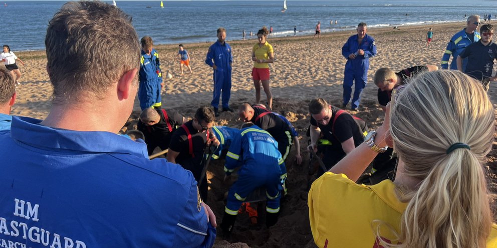 Ο διοικητής περιοχής ακτοφυλακής για το νότιο Ντέβον και τη νοτιοανατολική Κορνουάλη, έγραψε στο Twitter: «Τεράστια ανταπόκριση των υπηρεσιών έκτακτης ανάγκης απόψε σε κάποιον που παγιδεύτηκε στην άμμο στην παραλία του Έξμαουθ».