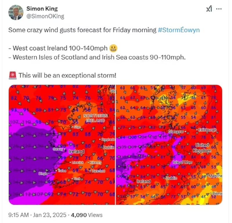 Κόκκινη προειδοποίηση για τους ανέμους εξέδωσε και η μετεωρολογική υπηρεσία της Ιρλανδίας εν όψει της άφιξης της καταιγίδας Eowyn, η οποία απειλεί να φέρει «σοβαρές και καταστροφικές ριπές».