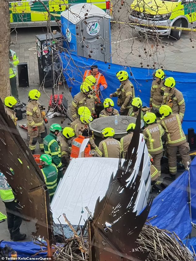 Σύμφωνα με την πυροσβεστική υπηρεσία, ο τεχνίτης σφήνωσε κάτω από το επίπεδο του δρόμου εξαιτίας του μηχανισμού που είχε τοποθετηθεί το βράδυ στον δρόμο αυτό, όπου βρίσκονται πολλά θέατρα, μπαρ και εστιατόρια. Για τον απεγκλωβισμό του κινητοποιήθηκαν 25 πυροσβέστες που σήκωσαν τον μηχανισμό χρησιμοποιώντας ένα βίντσι, όμως ήταν ήδη αργά…