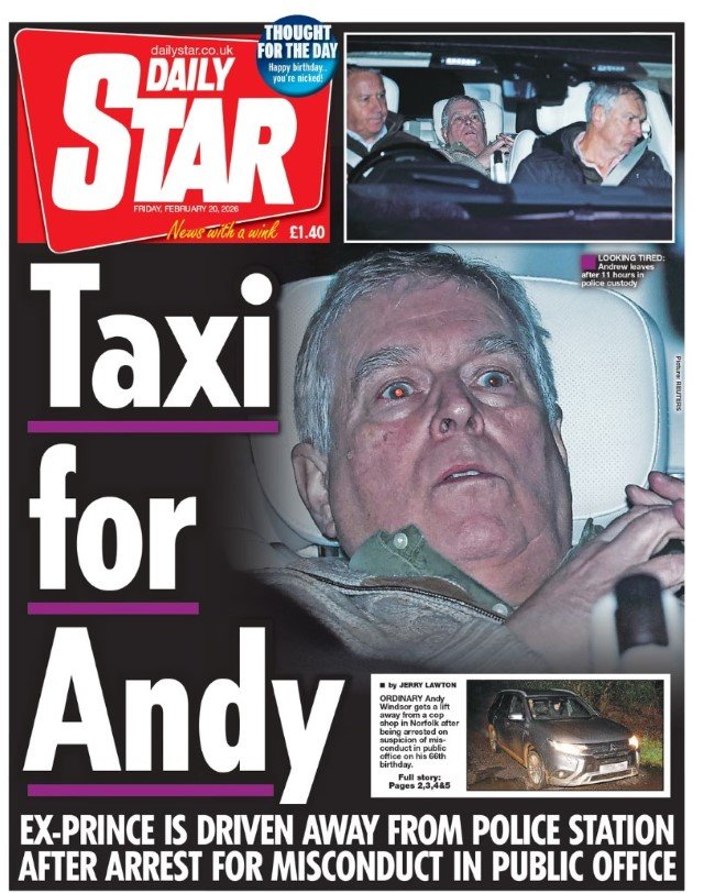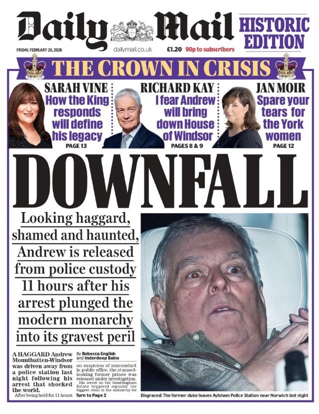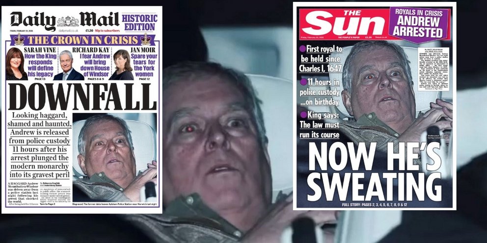 Η σύλληψη του πρώην μέλους της βασιλικής οικογένειας, έκπτωτου πρίγκιπα Άντριου, μονοπώλησε τα πρωτοσέλιδα των βρετανικών εφημερίδων, όπως ήταν αναμενόμενο.
