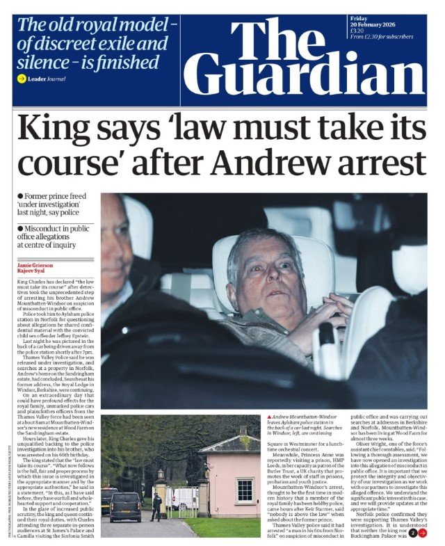 Ο Guardian επισημαίνει την αντίδραση του Μπάκιγχαμ στην είδηση της σύλληψης, με τίτλο: «Ο βασιλιάς λέει ''ο νόμος πρέπει να πάρει τον δρόμο του'' μετά τη σύλληψη του Άντριου».