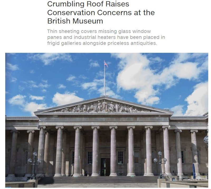 «Οι απαρχαιωμένες υποδομές σε αυτές τις αίθουσες, στις οποίες περιλαμβάνεται η γκαλερί με τα Μάρμαρα του Παρθενώνα, καταρρέουν. Οι οροφές στάζουν νερό, ο κλιματισμός δεν λειτουργεί, οι μπογιές ξεφλουδίζουν και τα πλακάκια δαπέδου έχουν ραγίσει. Δύο αίθουσες που γειτνιάζουν, η μία με ελληνικά και ρωμαϊκά γλυπτά (Gallery 23) και η άλλη με αριστουργήματα της ασσυριακής τέχνης (Gallery 8), είναι τώρα εκτεθειμένες στα στοιχεία της Φύσης, καθώς προστατεύονται μόνον από ένα λεπτό φύλλο υλικού απλωμένο πάνω από τους μεγάλους φεγγίτες στην οροφή για να καλύψει το άνοιγμα, που θα έπρεπε να καλύπτουν τα ενισχυμένα γυάλινα πάνελ», σημειώνει ο ιστότοπος Τέχνης θυμίζοντας ότι δεν είναι η πρώτη φορά που εντοπίζονται τέτοια προβλήματα στο Βρετανικό Μουσείο.