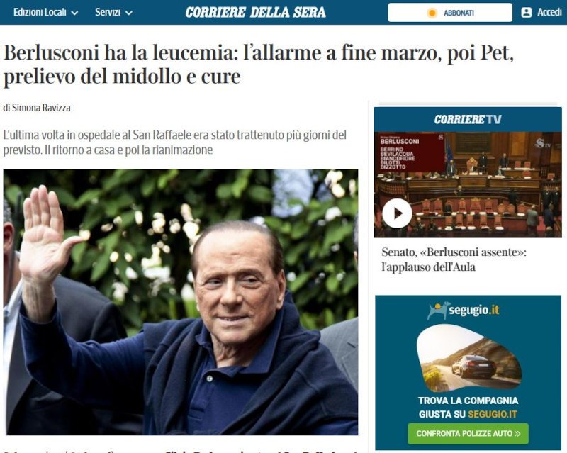 Η βεβαιότητα ότι κάτι σοβαρότερο τρέχει ήλθε λίγο αργότερα. Ο Σίλβιο Μπερλουσκόνι πάσχει από σοβαρή ασθένεια του αίματος: λευχαιμία. Η ίδια που προκάλεσε και τις προηγούμενες νοσηλείες του, άρα όχι μόνον εξετάσεις ρουτίνας, αλλά και οι αναγκαίες θεραπείες. Οι πόνοι που τον ταλαιπωρούν και η πνευμονία των τελευταίων ημερών είναι στην πραγματικότητα επιπλοκές που μπορούν να καταβάλουν έναν ήδη εξασθενημένο οργανισμό», σημειώνει η Corriere della Sera.