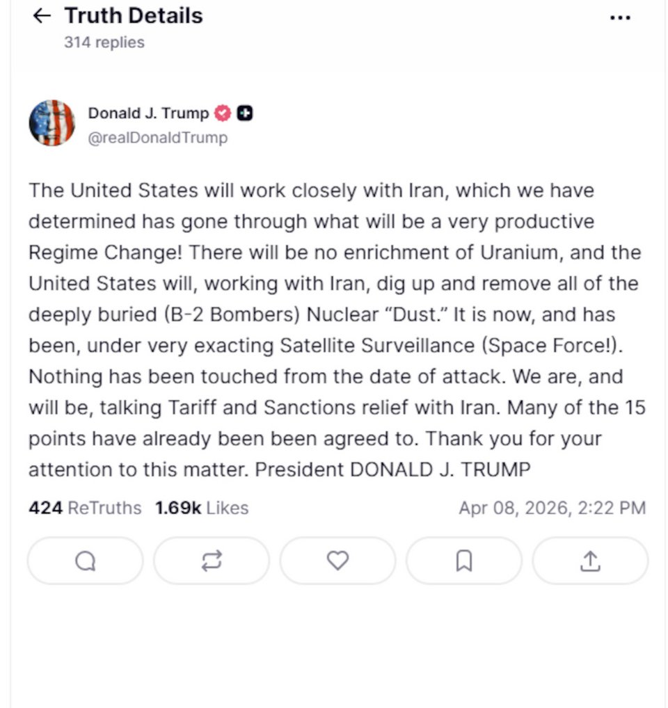 «Οι Ηνωμένες Πολιτείες θα συνεργαστούν στενά με το Ιράν, το οποίο έχουμε διαπιστώσει ότι έχει περάσει από αυτό που θα είναι μια πολύ παραγωγική αλλαγή καθεστώτος. Δεν θα υπάρξει εμπλουτισμός ουρανίου και οι ΗΠΑ, σε συνεργασία με το Ιράν, θα ανασύρουν και θα απομακρύνουν όλη τη βαθιά θαμμένη πυρηνική “σκόνη” (B-2 Bombers). Βρίσκεται ήδη, και βρισκόταν, υπό πολύ αυστηρή δορυφορική επιτήρηση (Space Force!). Τίποτα δεν έχει μετακινηθεί από την ημέρα της επίθεσης. Συζητάμε επίσης για δασμούς και άρση κυρώσεων με το Ιράν. Πολλά από τα 15 σημεία έχουν ήδη συμφωνηθεί».