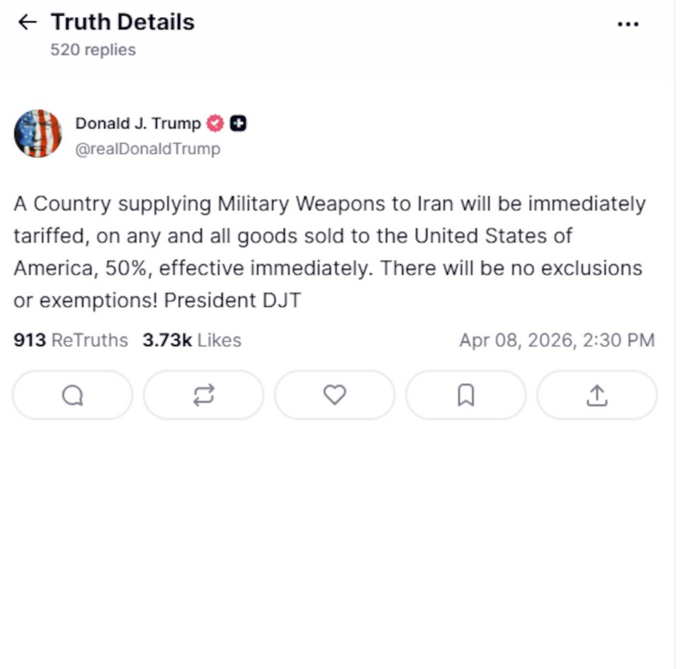 «Οποιαδήποτε χώρα προμηθεύει στρατιωτικό εξοπλισμό στο Ιράν θα επιβαρύνεται άμεσα με δασμούς 50% σε όλα τα προϊόντα που πωλούνται στις Ηνωμένες Πολιτείες. Δεν θα υπάρξουν εξαιρέσεις ή απαλλαγές», ανέφερε.