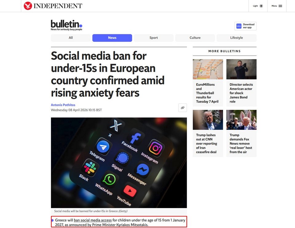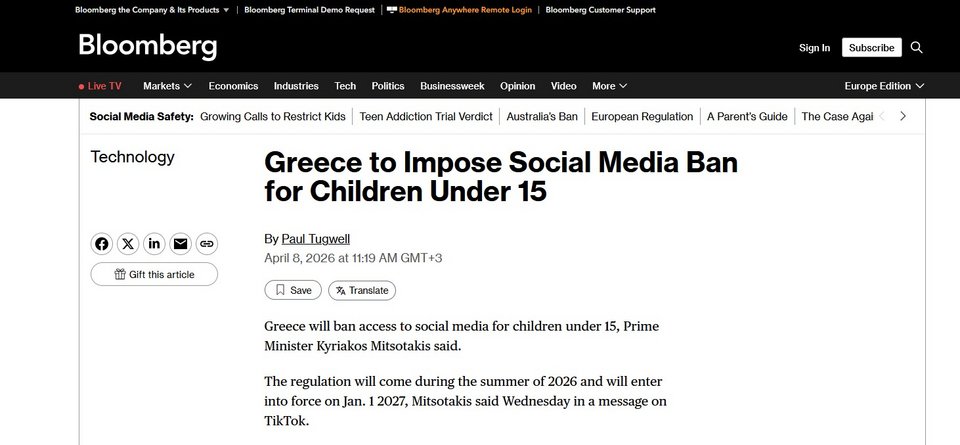 Αξίζει να σημειωθεί ότι η γαλλική Le Monde και το Reuters επισημαίνουν ότι τον περασμένο Δεκέμβριο, η Αυστραλία έγινε η πρώτη χώρα στον κόσμο που επέβαλε στις πλατφόρμες TikTok, YouTube, Snapchat να διαγράψουν τους λογαριασμούς χρηστών κάτω των 16 ετών, υπό την απειλή βαρύτατων προστίμων.