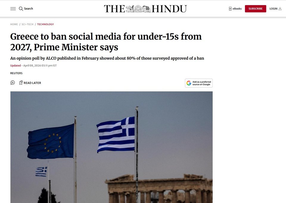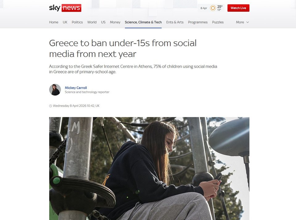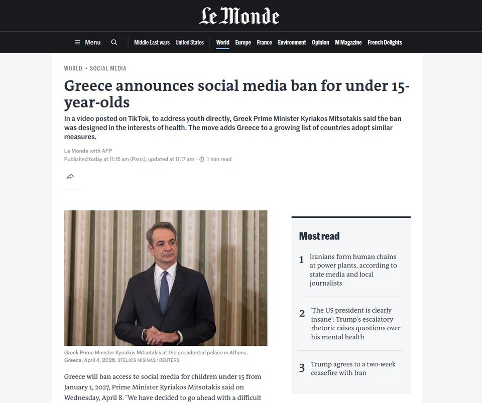Το γύρω των διεθνών ΜΜΕ κάνει η είδηση της απαγόρευσης πρόσβασης στα social media για παιδιά κάτω των 15 ετών, που ανακοίνωσε ο πρωθυπουργός Κυριάκος Μητσοτάκης.