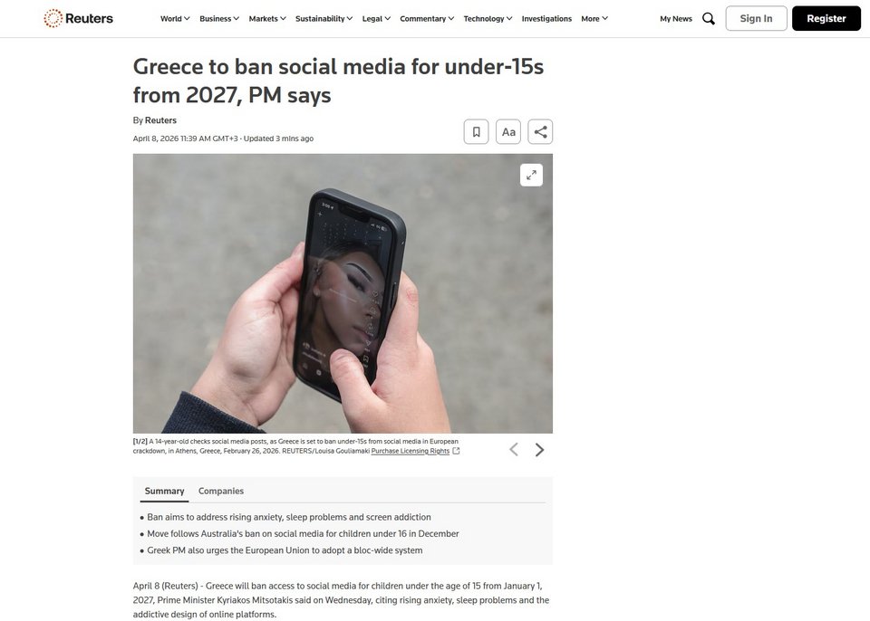 «Η ελληνική κυβέρνηση έχει ήδη απαγορεύσει τη χρήση κινητών τηλεφώνων στα σχολεία και έχει δημιουργήσει πλατφόρμες γονικού ελέγχου για τον περιορισμό του χρόνου που περνούν οι έφηβοι μπροστά στις οθόνες» σημειώνει το διεθνές πρακτορείο.