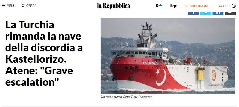 «Η Τουρκία ξαναστέλνει το πλοίο της διχόνοιας στο Καστελλόριζο», γράφει η “La Repubblica” σημειώνοντας ότι το Oruc Reis «βρέθηκε τον Αύγουστο στο επίκεντρο μιας σοβαρής κρίσης ανάμεσα στις δύο χώρες που κατέληξε στο τραπέζι του Ευρωπαϊκού Συμβουλίου, το οποίο απείλησε την Άγκυρα με κυρώσεις αν μέχρι τον Δεκέμβριο δεν έχει κάνει σαφή βήματα για την αποκλιμάκωση της έντασης.