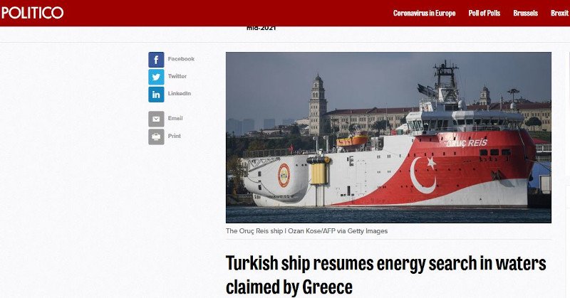 Με τίτλο «Τουρκικό πλοίο επαναλαμβάνει τις έρευνες για ενεργειακούς πόρους που διεκδικεί η Ελλάδα», το Politico αναφέρει ότι το «Oruc Reis», που «βρέθηκε στο επίκεντρο της κλιμάκωσης των εντάσεων στην Ανατολική Μεσόγειο», θα συνεχίσει τις έρευνές του μέχρι τις 22 Οκτωβρίου, σύμφωνα με τη NAVTEX που εξέδωσε η Άγκυρα.
