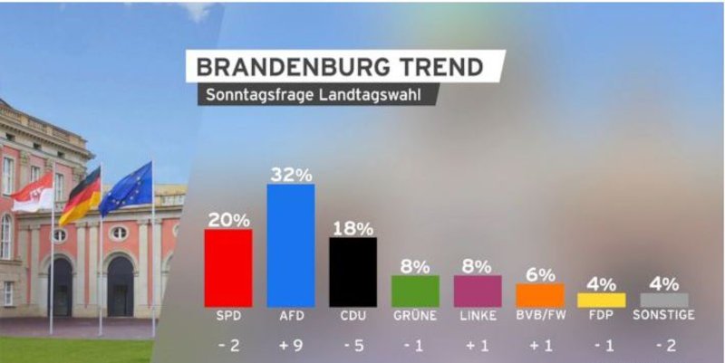 Αν στήνονταν κάλπες στο εν λόγω κρατίδιο την ερχόμενη Κυριακή, η ακροδεξιά AfD θα εξασφάλιζε ποσοστό 32% σύμφωνα με τη σφυγμομέτρηση του ινστιτούτου Infratest-dimap για λογαριασμό των rbb24 και Antenne Brandenburg, δηλαδή εννέα ποσοστιαίες μονάδες περισσότερες από εκείνες που της έδινε η τελευταία δημοσκόπηση, του RBB, στο Βρανδεμβούργο, τον περασμένο Απρίλιο.