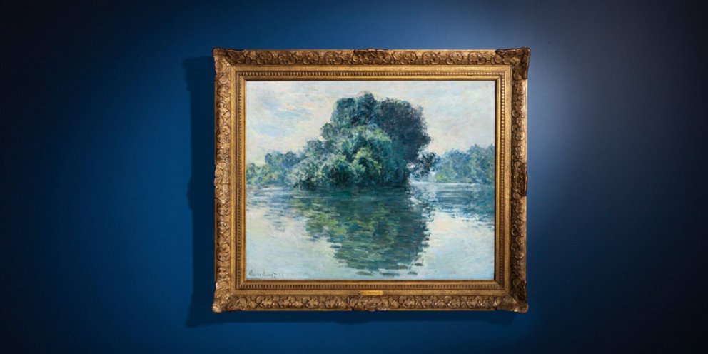 Ο πρώτος πίνακας, «Les Iles de Port-Villez» (1897), αποτυπώνει τον Σηκουάνα κοντά στο Ζιβερνί με τη χαρακτηριστική αλληλεπίδραση φωτός και νερού του Μονέ. Ζωγραφισμένος κατά την ώριμη περίοδό του, ο καμβάς αντανακλά τη γοητεία που του ασκούσαν οι μεταβαλλόμενες καιρικές συνθήκες, καθώς η επιφάνεια του ποταμού διαλύεται σε λαμπερές αντανακλάσεις.