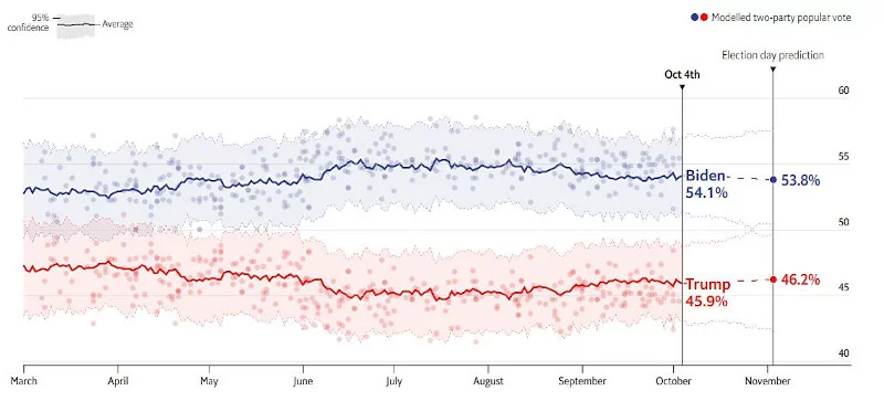 Έτσι, αν στήνονταν χθες (4 Οκτωβρίου) οι κάλπες, ο Μπάιντεν θα κέρδιζε τη λαϊκή ψήφο με ποσοστό 54,1% έναντι 45,9% του Τραμπ, ενώ για την κρίσιμη αναμέτρηση της 3ης Νοεμβρίου δίνει 53,8% στον πρώην αντιπρόεδρο των ΗΠΑ έναντι 45,9% στον νυν ένοικο του Λευκού Οίκου. Ο Economist παραθέτει ακόμη δέκα τελευταίες δημοσκοπήσεις , που διεξήχθησαν (όλες πλην μιας) διαδικτυακά και δίνουν προβάδισμα από 3,2% έως 15,2% στον Μπάιντεν.