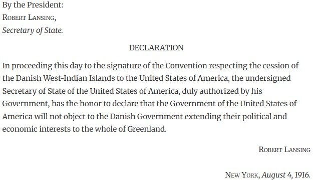 «Προχωρώντας σήμερα στην υπογραφή της Σύμβασης σχετικά με την παραχώρηση των Δανικών Δυτικοϊνδικών Νήσων στις Ηνωμένες Πολιτείες Αμερικής, ο κάτωθι υπογεγραμμένος Υπουργός Εξωτερικών των Ηνωμένων Πολιτειών Αμερικής, δεόντως εξουσιοδοτημένος από την κυβέρνησή του, έχει την τιμή να δηλώσει ότι η κυβέρνηση των Ηνωμένων Πολιτειών Αμερικής δεν θα αντιταχθεί στην επέκταση των πολιτικών και οικονομικών συμφερόντων της δανικής κυβέρνησης σε ολόκληρη τη Γροιλανδία.
