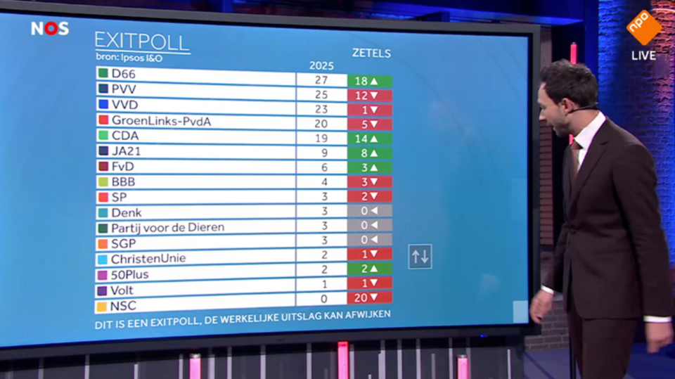 Συγκεκριμένα, το exit poll δίνει ότι το D66 θα κερδίσει 27 έδρες στην Κάτω Βουλή των 150 εδρών, ενώ το Κόμμα της Ελευθερίας εμφανίζεται δεύτερο με 25. Η δημοσκόπηση έχει περιθώριο σφάλματος έως και τρεις έδρες.
