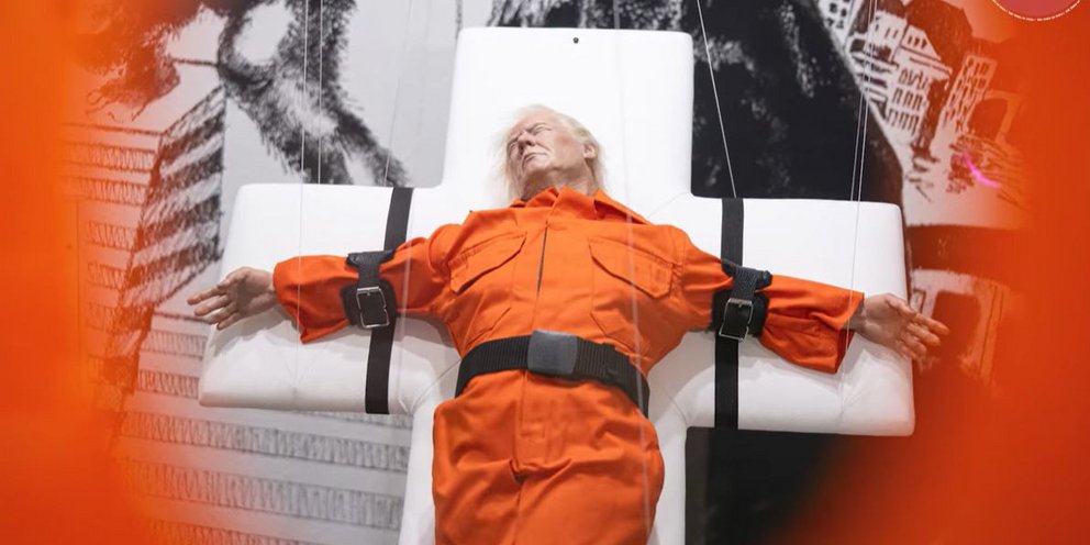 Ο Ντόναλντ Τραμπ, με πορτοκαλί φόρμα κρατουμένου, δεμένος σε έναν σταυρό-κρεβάτι εκτέλεσης: ένα προβοκατόρικο γλυπτό του Βρετανού καλλιτέχνη Μέισον Στορμ, εκτίθεται εδώ και μερικές ημέρες στην Ελβετία.