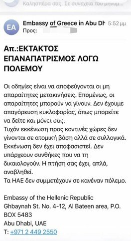«Το Σάββατο επικοινωνήσαμε με την ελληνική πρεσβεία και μας είπαν απλώς να είμαστε ήρεμοι, να μην πηγαίνουμε σε επικίνδυνα μέρη και πως δεν είχαν κάποια ενημέρωση για το αν θα μπορέσουν με κάποιον τρόπο να μας γυρίσουν πίσω στην Ελλάδα. Μας ζήτησαν, επίσης, να δώσουμε τρεις φορές τα στοιχεία μας στο site σε περίπτωση που θέλουμε επαναπατρισμό».