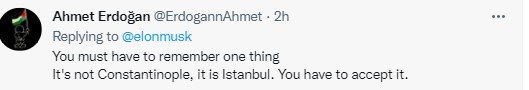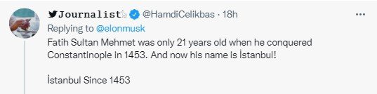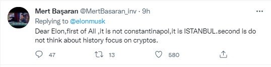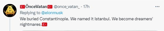 Σε αυτή την περίπτωση, ο Έλον Μασκ προκάλεσε την οργή των Τούρκων χρηστών της πλατφόρμας. Αφορμή ήταν μια ανάρτησή του, στην οποία χρησιμοποιείται η λέξη «Κωνσταντινούπολη». «Μην μιλάς για την ιστορία, επικεντρώσου στα κρυπτονομίσματα», συμβουλεύει ένας Τούρκος χρήστης τον Έλον Μασκ, τονίζοντας επίσης ότι «Δεν λέγεται Κωνσταντινούπολη, λέγεται Istanbul».
