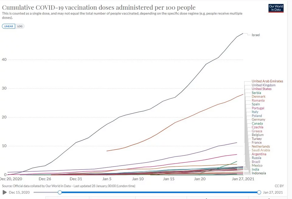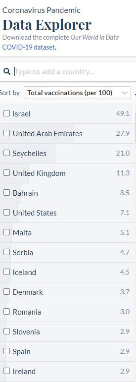 Σύμφωνα με τα επίσημα στοιχεία που έχει συγκεντρώσει ο οργανισμός (η OWID είναι μια επιστημονική διαδικτυακή σελίδα που εστιάζει σε μεγάλα παγκόσμια προβλήματα όπως φτώχεια, ασθένειες, πείνα, κλιματική αλλαγή, πόλεμος, υπαρξιακοί κίνδυνοι και ανισότητες. Ο ιδρυτής της έκδοσης είναι ο κοινωνικός ιστορικός και οικονομολόγος Μαξ Ρόζερ. Η ερευνητική ομάδα εδρεύει στο Πανεπιστήμιο της Οξφόρδης), το Ισραήλ έχει την πιο εντυπωσιακή επίδοση ως τώρα, καθώς έχει καταφέρει να εμβολιάσει σχεδόν έναν στους δύο κατοίκους.