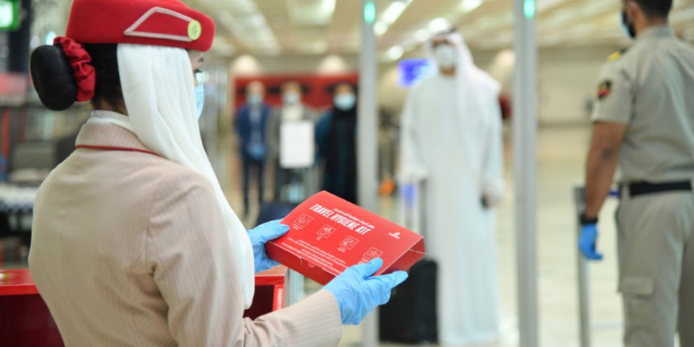 Η Emirates διαθέτει δωρεάν ατομικά σετ υγιεινής φροντίδας για κάθε επιβάτη κατά τον έλεγχο των εισιτηρίων στο Διεθνές Αεροδρόμιο του Ντουμπάι και σε πτήσεις προς Ντουμπάι. Κάθε σετ περιλαμβάνει μάσκες, γάντια, αντιβακτηριακά μαντηλάκια και απολυμαντικό χεριών.