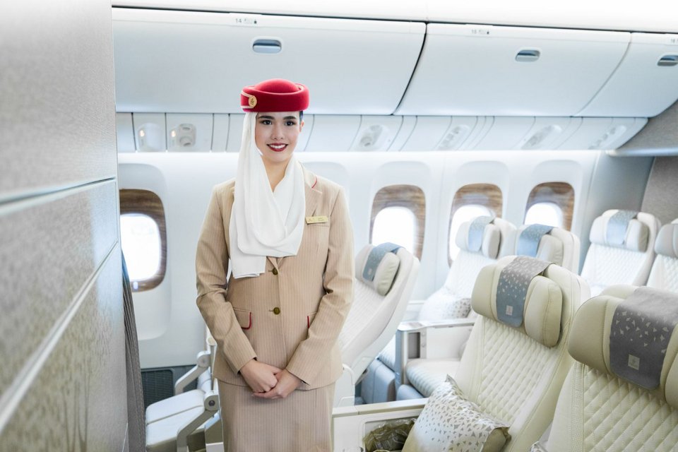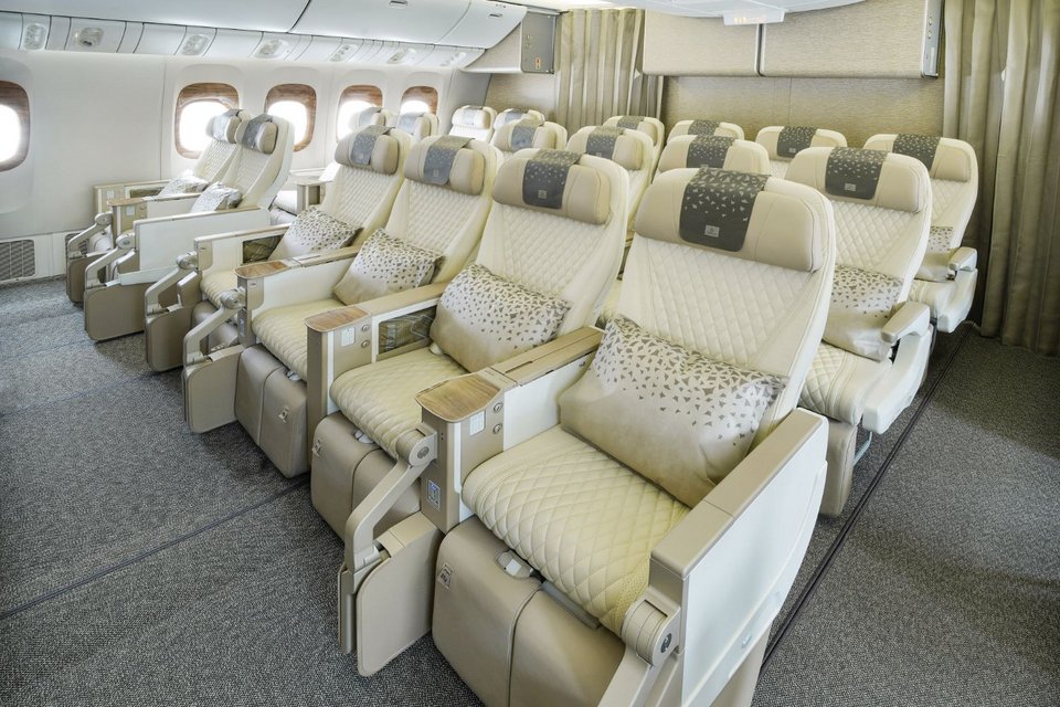 Διακεκριμένη θέση: Εμπνευσμένη από το εμβληματικό A380 της Emirates, η καμπίνα της διακεκριμένης θέσης διαθέτει 40 καθίσματα σε διάταξη 1-2-1, εξασφαλίζοντας άμεση πρόσβαση στον διάδρομο για κάθε επιβάτη. Τα πολυτελή δερμάτινα καθίσματα, οι σαμπανιζέ λεπτομέρειες, το προσωπικό mini-bar και οι ξύλινες επενδύσεις δημιουργούν μια κομψή ατμόσφαιρα. Κάθε κάθισμα μετατρέπεται σε άνετο κρεβάτι 78,6 ιντσών και διαθέτει οθόνη 23 ιντσών HD για κορυφαία ψυχαγωγία εν πτήσει.