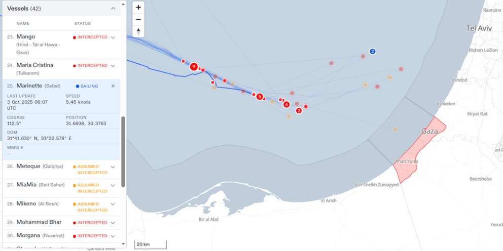 «Το Marinette συνεχίζει να πλέει», επεσήμαναν οι διοργανωτές του Global Sumud Flotilla χθες το βράδυ στα μέσα κοινωνικής δικτύωσης, προσθέτοντας ότι αναμένουν να αναχαιτιστεί και αυτό σύντομα. «Γνωρίζουμε τι μας περιμένει», τόνισαν.
