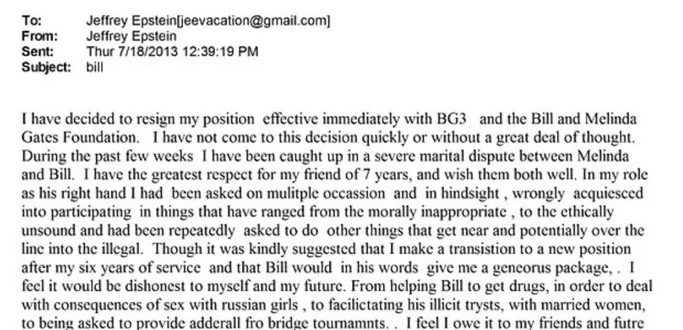 Το μέιλ, που είχε κρατήσει ο ίδιος ως προσχέδιο για να το στείλει κάποια στιγμή στον Γκέιτς, γράφτηκε στις 18 Ιουλίου του 2013. Εκεί, ο Έπσταϊν φέρεται να αναφέρει πως τον συμβούλευε για ένα σεξουαλικώς μεταδιδόμενο νόσημα που κόλλησε από «νεαρές Ρωσίδες», αλλά και πως ο Γκέιτς του είχε ζητήσει να του βρει αντιβιοτικά για να τα δίνει στη σύζυγό του, Μελίντα. Επίσης, περιγράφει την «απογοήτευσή» του, καθώς ύστερα από 6 χρόνια φιλίας ο Γκέιτς τον απέφευγε.