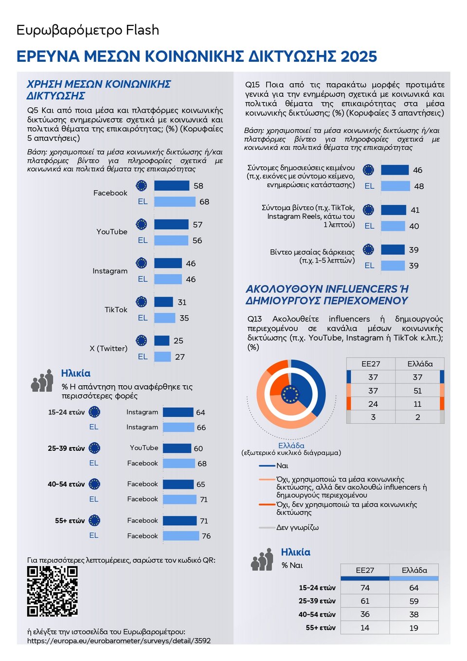 - Σχεδόν επτά στους δέκα (68%) προτιμούν να χρησιμοποιούν το Facebook για να ενημερώνονται στην Ελλάδα, ποσοστό υψηλότερο από τον μέσο όρο στην ΕΕ (58%). Οι νέοι ηλικίας 15-24 ετών στην Ελλάδα δήλωσαν ότι πρώτη πηγή ενημέρωσής τους για κοινωνικά και πολιτικά ζητήματα είναι το Instagram (66%), γεγονός που συμβαδίζει και με τα δεδομένα για τους νέους γενικά στην ΕΕ (64%).
