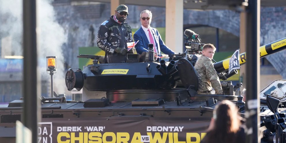 - Ο Ντέρεκ Τσισόρα και ο Νάιτζελ Φάρατζ έκαναν μια θεαματική είσοδο σε συνέντευξη Τύπου στο Λονδίνο πάνω σε άρμα μάχης, ενόψει του αγώνα του Τσισόρα με τον Γουάιλντερ.