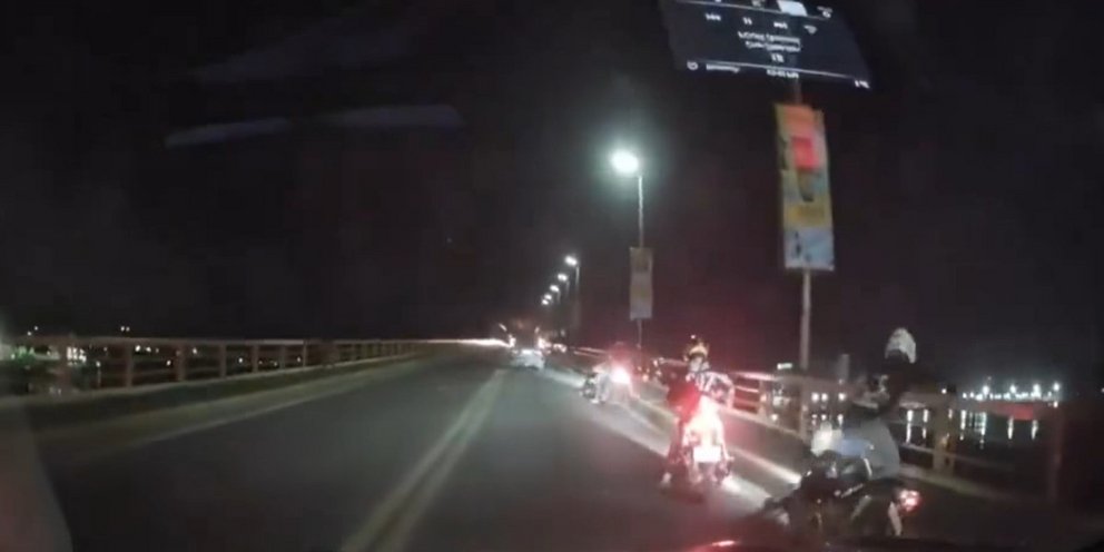 Οδηγοί δικύκλων κατεβαίνουν από τα σκούτερ τους και κάθονται στην άκρη του δρόμου, ενώ ο σεισμός διαρκεί αρκετά και η γέφυρα φαίνεται να πηγαίνει πέρα-δώθε σαν εκκρεμές.
