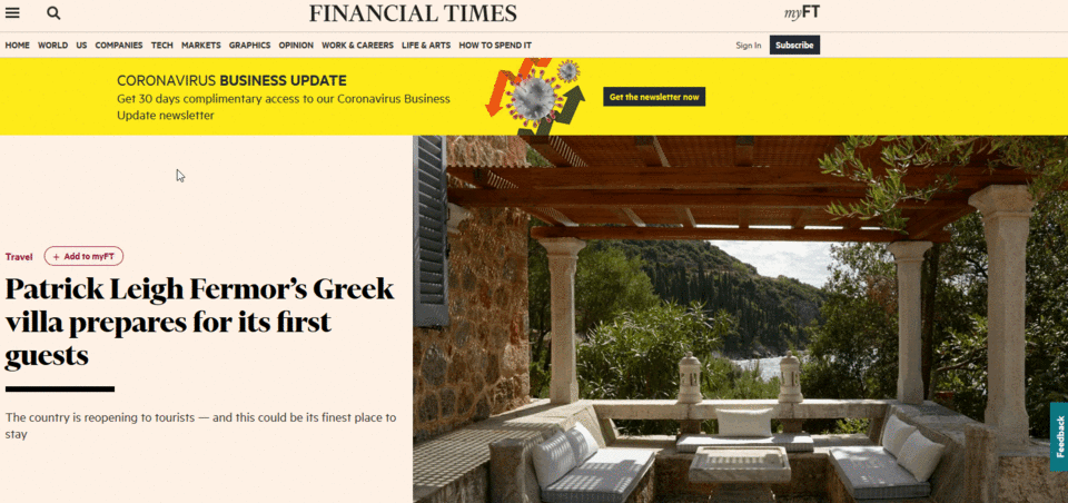 Στην έντυπη έκδοση των Financial Times, καθώς και στην ιστοσελίδα της εφημερίδας, δημοσιεύεται εκτενές άρθρο της Alev Scott για την ενοικίαση της βίλας του κορυφαίου Άγγλου ταξιδιωτικού συγγραφέα Πάτρικ Λι Φέρμορ, στο Καλαμίτσι, κοντά στην Καρδαμύλη, από τώρα έως τα τέλη Σεπτεμβρίου, με τίμημα €4,000/βράδυ.