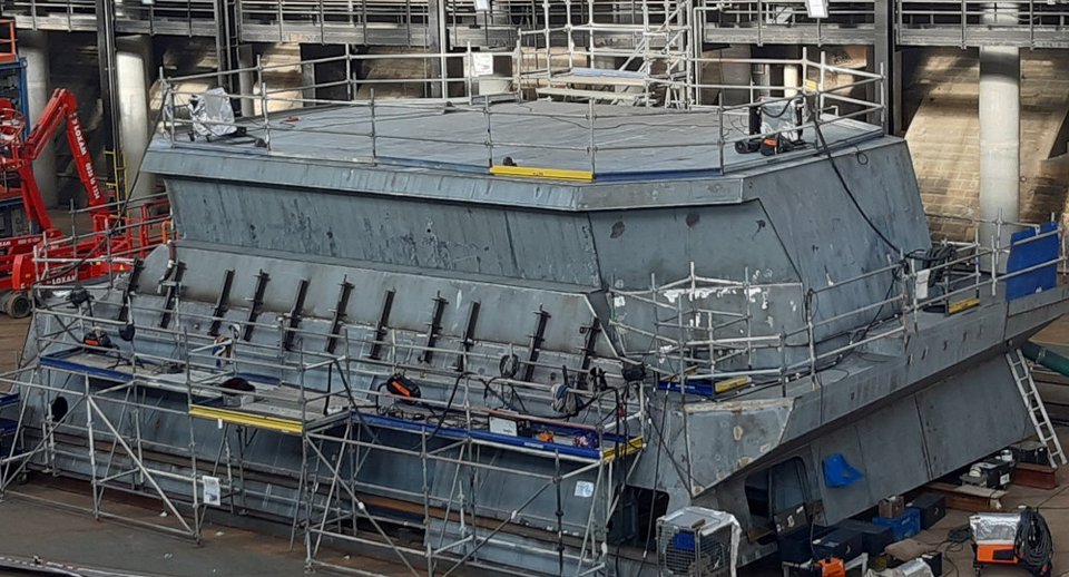 Σημαντική πρόοδος στη ναυπήγηση της πρώτης ελληνικής φρεγάτας FDI «Belharra» κλάσεως «Κίμων» επετεύχθη επτά εβδομάδες μετά την τοποθέτηση του πρώτου μπλοκ της φρεγάτας στη δεξαμενή, στα ναυπηγεία της Naval Group, στο Λοριάν της Γαλλίας.