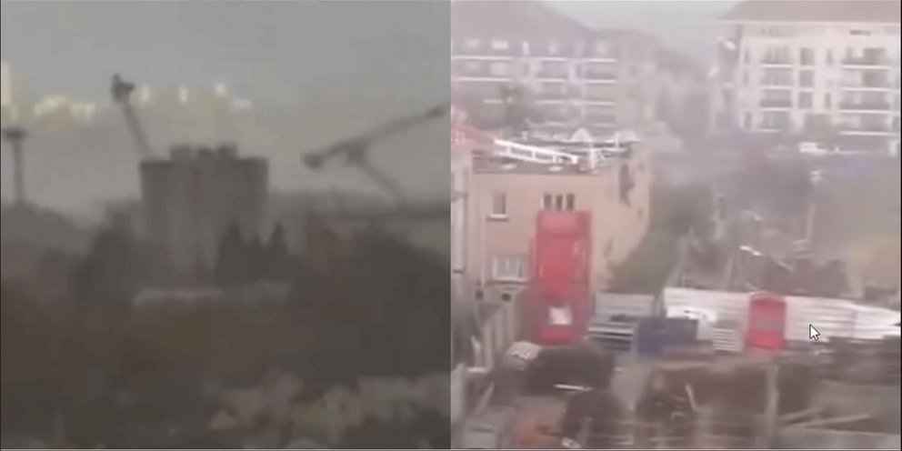 Βίντεο που κοινοποιήθηκαν στα μέσα κοινωνικής δικτύωσης έδειξαν τον ανεμοστρόβιλο να γκρεμίζει τρεις γερανούς με διαφορά λίγων δευτερολέπτων ο ένας από τον άλλον.