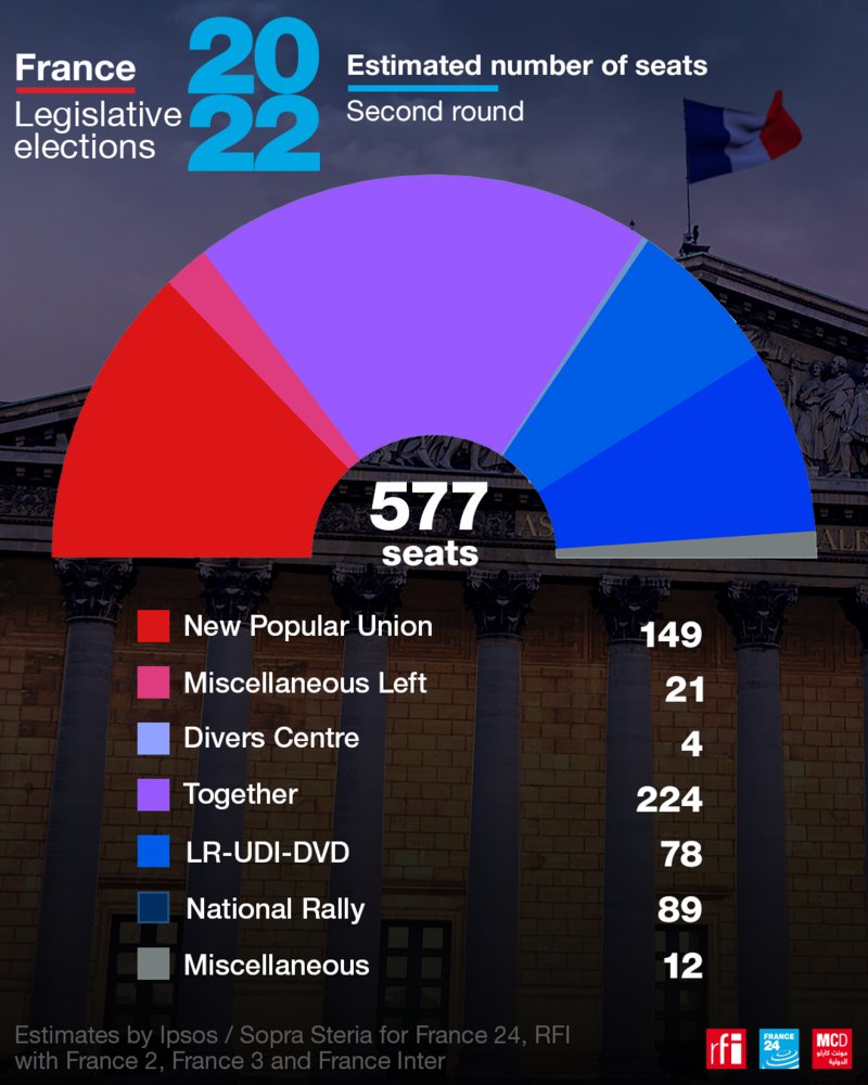Σύμφωνα με το ίδιο ΜΜΕ η αριστερή συμμαχία Nupes των Σοσιαλιστών, Οικολόγων και Κομμουνιστών υπό την «Ανυπόταχτη Γαλλία» του νεοκομμουνιστή Ζαν-Λικ Μελανσόν αναμένεται να έρθει δεύτερη εξαφαλίζοντας παό 163 έως 203 έδρες, ενώ τρίτη δύναμη στη νέα Γαλλική Εθνοσυνέλευση προβλέπεται να αναδειχθεί ο ακροδεξιός Εθνικός Συναγερμός της Μαρίν Λεπέν εξασφαλίζοντας από 67 έως 90 έδρες και θα σχηματίσει κοινοβουλευτική ομάδα για πρώτη φορά εδώ και δεκαετίες, που θα του επιτρέψει να εκφράζει τις απόψεις του από το βήμα της Βουλής, αλλά και πρόσβαση σε επιτροπές και χρήμα. Η συντηρητική δεξιά των Ρεπουμπλικανών μαζί με το κεντροδεξιό UDI αναμένεται, σύμφωνα πάντα με την ίδια πηγή, να εξασφαλίσει από 30 έως 50 έδρες.