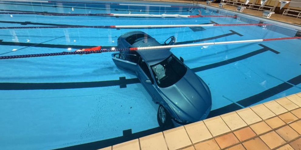 Οι δύο ναυαγοσώστες και ο κολυμβητής που ήταν ακόμα εκεί εκείνη την ώρα έμειναν άναυδοι όταν άκουσαν τον εκκωφαντικό θόρυβο και σε κλάσματα του δευτερολέπτου αντίκρισαν ένα αυτοκίνητο στον πάτο της πισίνας.