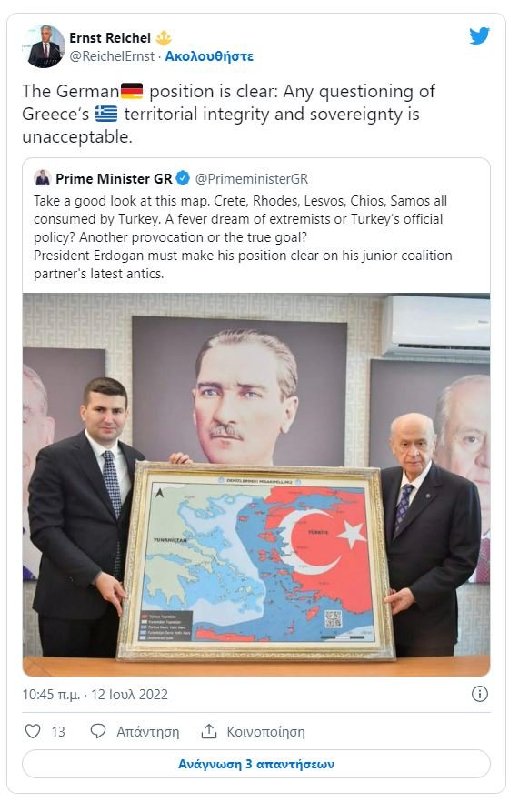 Συγκεκριμένα ο κ. Ράιχελ με ανάρτησή του στον προσωπικό του λογαριασμό στο Twitter, κοινοποίησε την χθεσινή ανάρτηση του πρωθυπουργού στην οποία ο Κυριάκος Μητσοτάκης καλούσε τον Ρετζέπ Ταγίπ Ερντογάν να λάβει θέση για τον χάρτη που δείχνει ακόμη και την Κρήτη ως μέρος της Τουρκίας.