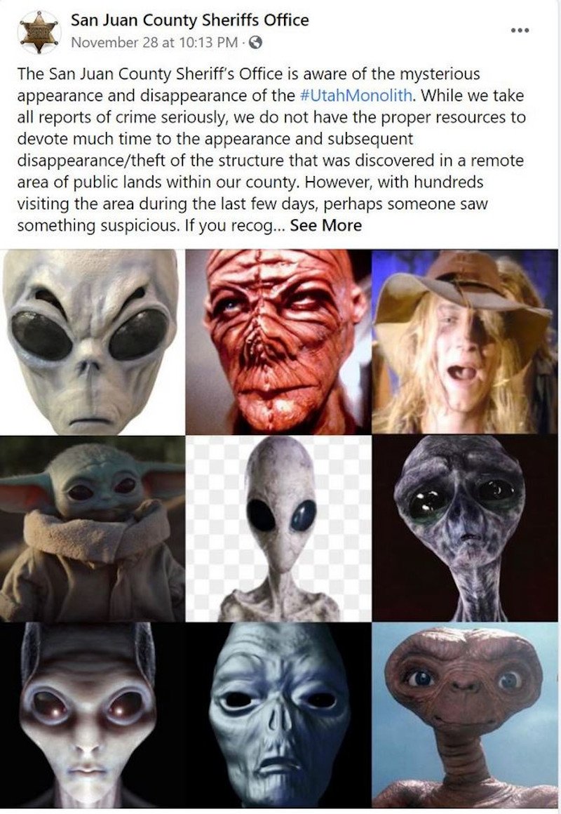 Η ιστορία ξεκίνησε στις 18 Νοεμβρίου όταν εντοπίστηκε σε γη ιδιοκτησίας της Υπηρεσία Χωροταξίας της Γιούτα, το μυστηριώδες πρισματικό μεταλλικό αντικείμενο - που καταχρηστικά αποκαλέστηκε «μονόλιθος»-, πυροδοτώντας μια σειρά εικασιών για την προέλευσή του και τους λόγους που εμφανίστηκε εκεί. Πολλοί άρχισαν αστειευόμενοι να υποδεικνύουν «εξωγήινους ως υπεύθυνους», ενώ το θέμα σχολίασε με το γνωστό του χιούμορ ακόμη και ο διάσημος παρουσιαστής του “Late Show” Στίβεν Κόλμπερτ: «Ο Μονόλιθος σας διατάζει να επισκεφτείτε τη Γιούτα»...