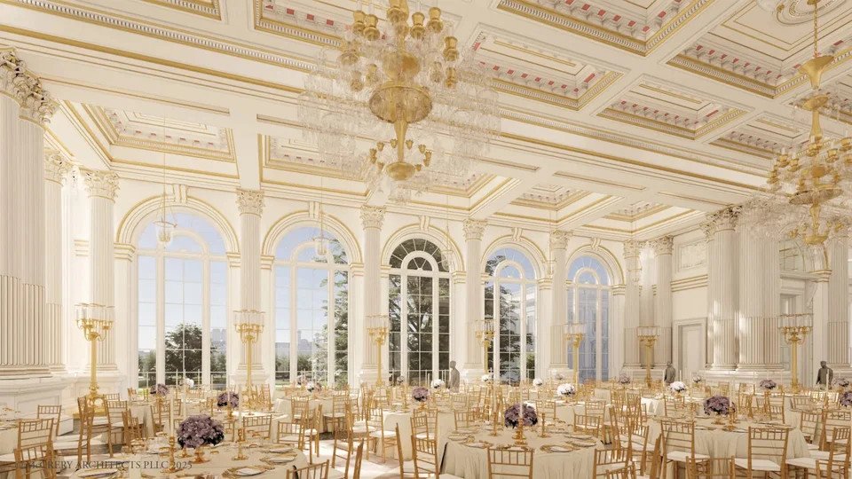 «Το έργο έχει επεκταθεί και βελτιωθεί πλήρως - πιστεύω ότι θα είναι η πιο όμορφη αίθουσα χορού οπουδήποτε στον κόσμο» δήλωσε ο Ντόναλντ Τραμπ κατά τη διάρκεια μιας συζήτησης στρογγυλής τραπέζης στην Κρατική Τραπεζαρία του Λευκού Οίκου.