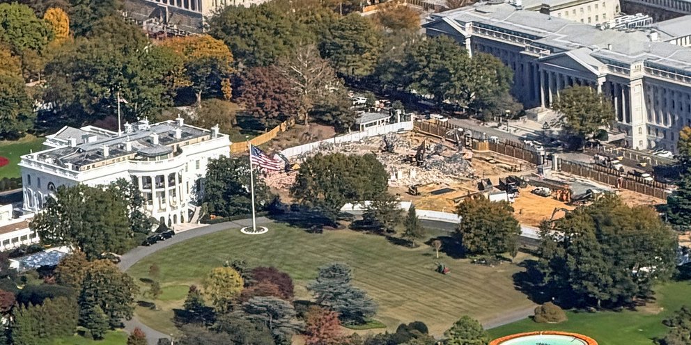 Μια δορυφορική φωτογραφία που τραβήχτηκε το πρωί της Πέμπτης δείχνει ολόκληρη την Ανατολική Πτέρυγα του Λευκού Οίκου να έχει κατεδαφιστεί. Σωροί από μπάζα σχηματίζουν το περίγραμμα του σημείου στο οποίο βρισκόταν το κτίριο και το οποίο, παραδοσιακά, στέγαζε το Γραφείο της Πρώτης Κυρίας.
