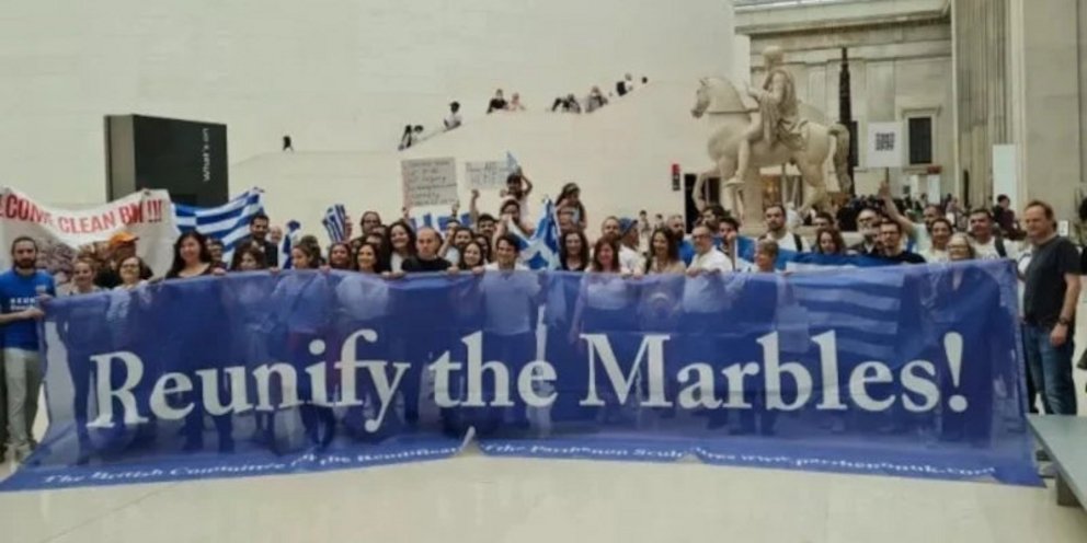 Δεκάδες διαδηλωτές, Έλληνες και Βρετανοί, συγκεντρώθηκαν στο Βρετανικό Μουσείο, στην αίθουσα που φιλοξενεί τα γλυπτά του Παρθενώνα, ζητώντας την επιστροφή τους στην Αθήνα.