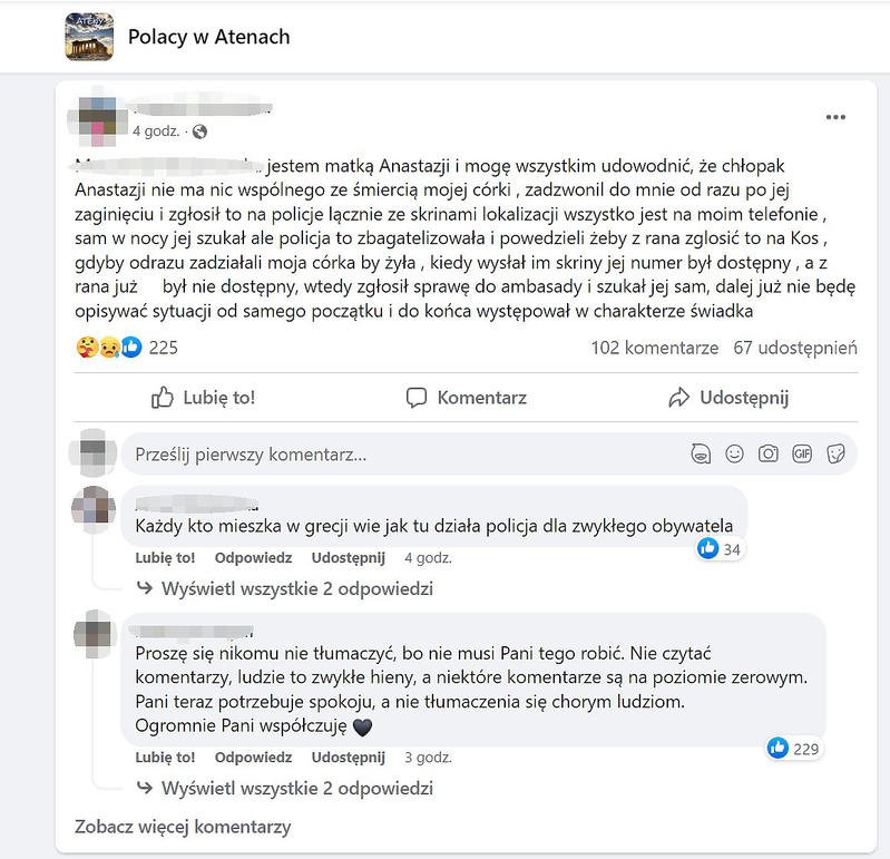 «Είμαι η μητέρα της Αναστάζια και μπορώ να αποδείξω σε όλους ότι το αγόρι της δεν έχει καμία σχέση με το θάνατο της κόρης μου. Μου τηλεφώνησε αμέσως μετά την εξαφάνισή της και το ανέφερε στην αστυνομία, συμπεριλαμβανομένων των screengrabs της τοποθεσίας. Ολα είναι στο τηλέφωνό μου. Την έψαχνε ο ίδιος τη νύχτα, αλλά η αστυνομία το υποβάθμισε και είπε να το αναφέρει το πρωί. Αν είχαν ενεργήσει αμέσως, η κόρη μου θα ήταν ζωντανή. Αρχικά, το κινητό της ήταν ανοικτό, το πρωί όμως δεν ήταν διαθέσιμο. Τότε ανέφερε το θέμα στην πρεσβεία και την έψαχνε και ο ίδιος. Δεν θα περιγράψω περαιτέρω την κατάσταση, από την αρχή και μέχρι το τέλος ενήργησε ως μάρτυρας», έγραψε η μητέρα της Αναστασίας στην ομάδα «Πολωνοί στην Αθήνα».