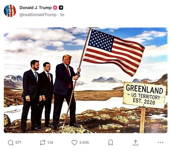 Ο Ντόναλντ Τραμπ προκάλεσε αντιδράσεις με ανάρτηση που δείχνει, μέσω AI-generated εικόνας, τον ίδιο να φυτεύει αμερικανική σημαία στη Γροιλανδία, ενισχύοντας την επιθυμία του για την προσάρτησή της.