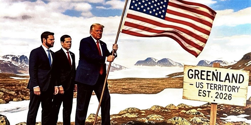 Στην ίδια εικόνα εμφανίζονται ο αντιπρόεδρος Τζέι Ντι Βανς και ο υπουργός Εξωτερικών Μάρκο Ρούμπιο δίπλα του, με τον Τραμπ ελαφρώς υπερυψωμένο ενώ κρατά τη σημαία, με μια πινακίδα που γράφει με κεφαλαία γράμματα: «Γροιλανδία, έδαφος των ΗΠΑ από το 2026».