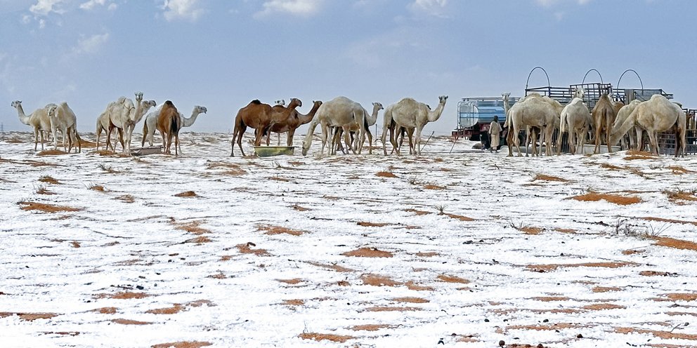 Όπως αναφέρουν μετεωρολόγοι, συστήματα χαμηλής πίεσης περνούν πάνω από τη Μέση Ανατολή χαριζοντάς μας εξαιρετικές και σπάνιες εικόνες, όπως καμήλες να διανύουν αποστάσεις μέσα στο λευκό τοπίο.