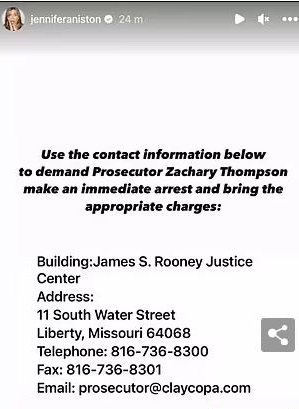 Μέσα από μια σειρά από στόρι στο Instagram, η διάσημη ηθοποιός εξήγησε τη Δευτέρα τι συνέβη στον άτυχο 16χρονο, ζητώντας δικαιοσύνη. Η Άνιστον δημοσίευσε επίσης τη διεύθυνση επικοινωνίας του εισαγγελέα και έγραψε: «Χρησιμοποιήστε τα στοιχεία επικοινωνίας παρακάτω για να ζητήσετε από τον εισαγγελέα Ζάχαρι Τόμσον να προβεί σε άμεση σύλληψη και να ασκήσει τις ανάλογες κατηγορίες».