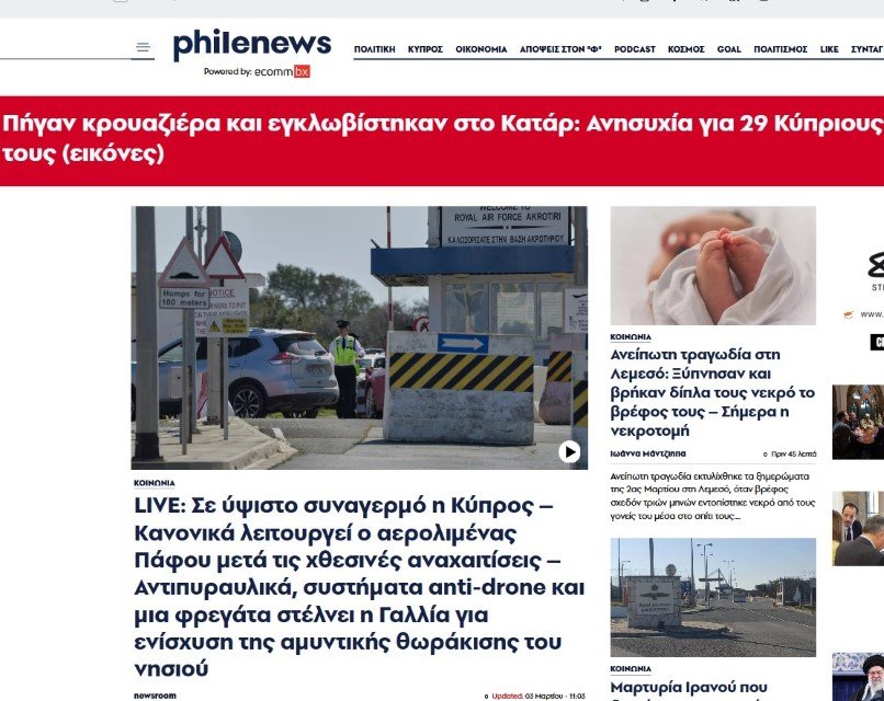 Βρισκόμαστε στην τέταρτη μέρα από τη συντονισμένη επίθεση των ΗΠΑ και του Ισραήλ στο Ιράν και τα επακόλουθα αντίποινα της Τεχεράνης. Η Κύπρος βρέθηκε χθες στο επίκεντρο των εξελίξεων όταν drones, που προήλθαν από τη Βηρυτό και τη στηριζόμενη από το Ιράν Χεζμπολάχ, στοχοθέτησαν βρετανική στρατιωτική βάση στο Ακρωτήρι.