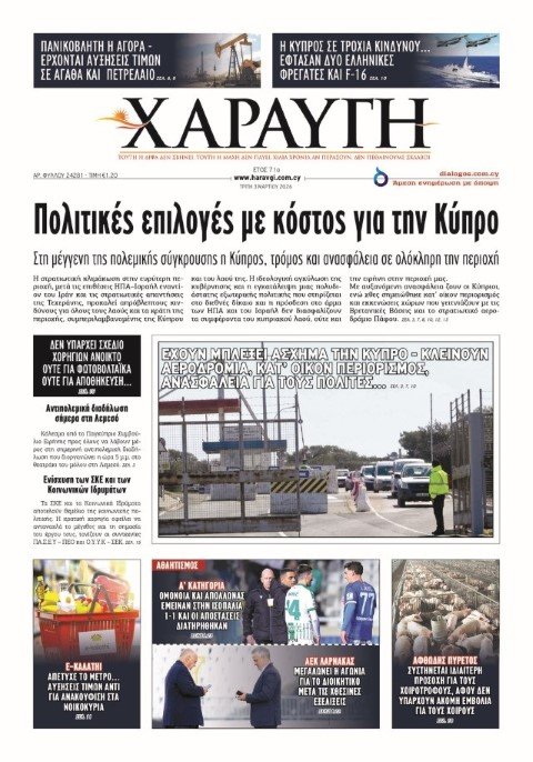 Με αυτόν τον τίτλο η κυπριακή «Χαραυγή» επισημαίνει τον «τρόμο και την ανασφάλεια σε ολόκληρη την περιοχή», ενώ αναφέρεται χαρακτηριστικά ότι το νησί βρίσκεται σε «τροχιά κινδύνου... έφτασαν δύο ελληνικές φρεγάτες και F-16».
