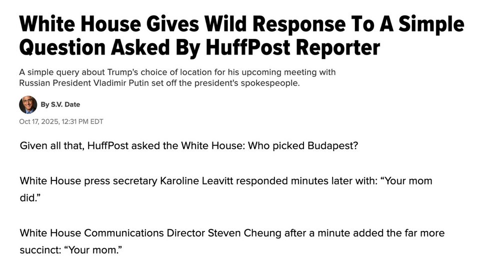 Η Καρολάιν Λέβιτ απάντησε στον δημοσιογράφο της HuffPost που της έκανε την ερώτηση με ένα σχόλιο με χυδαίο υπονοούμενο, και μάλιστα σε ανάρτησή της το δικαιολόγησε ως σχόλιο κατά ενός «αριστερού που επιτίθεται συνεχώς στον Τραμπ».