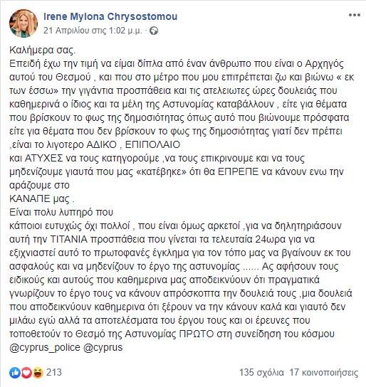 Με ανάρτησή της στο Facebook, η γυναίκα του Αρχηγού της Αστυνομίας Ζαχαρία Χρυσοστόμου, Ειρήνη Μυλωνά-Χρυσοστόμου, σχολίασε υπερασπιζόμενη τον σύζυγό της, τις κριτικές που δέχεται από πολίτες, για την αδυναμία του ιδίου, να εμποδίσει τις δολοφονίες του serial killer.